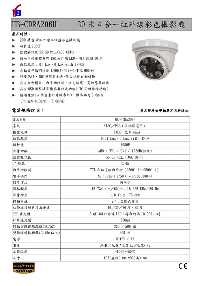 HB-CDRA206H 30米4合一紅外線彩色攝影機