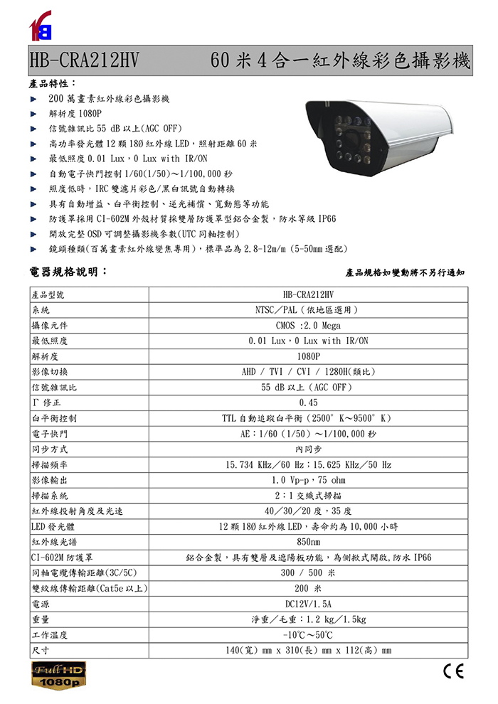 HB-CRA212HV 60米4合一紅外線彩色攝影機