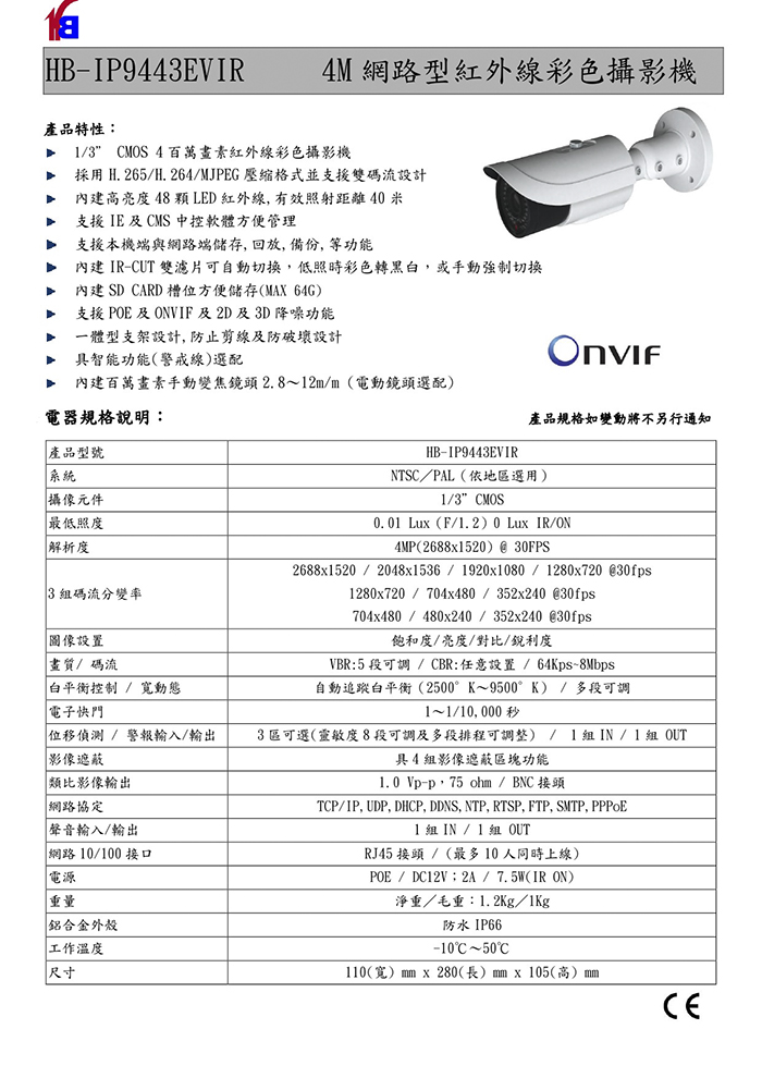 HB-IP9443EVIR 4M網路型紅外線彩色攝影機