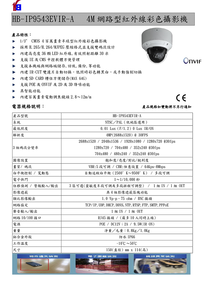 影像壓縮格式: H.265雙碼流 支援4路影像5M/4M/1080P/720P AHD / TVI / CVI / WD1輸入 具滑鼠控制OSD/PTZ等功能 面板具錄影,網路,電源等燈號 具有密碼層級保護功能及新增管理權限功能 備份方式1組USB3.0或網路備份 監看及回放攝影機名稱可顯示英文數字或15個中文字 支援3G手機監看功能(Android/iPhone/iPad) 支援2路 IP攝影機輸入/最大可切換成6CH IP輸入 支援遠端影像推撥功能 產品型號 即時顯示速度 5MP@80fps ; 4MP, 3MP, 1080P, 720P, WD1@120 fps 錄影張數(fps)NTSC 5MP Lite @40 fps / 4MP Lite @48 fps / 1080P(1920x1080) @60 fps / 720P/WD1(960x480)@120 fps 每門單獨調整錄影張數 畫面顯示功能 1/4/6/8/9分割畫面,及畫面跳台,7倍數位放大 錄影方式 手動/全時/排程/位移/警報/全時+位移/全時+警報/全時+位移警報 錄影品質設定 主碼流: 768kb~8Mbps /子碼流:128kb~1024kb 回放搜尋方式 時間切片/任意時間搜尋/檔案時間搜尋/事件搜尋 回放速度 正轉/倒轉:x1,x2,x4,x8,x16,x32 回放 主機端: 4路 / 遠端: 4路 OSD顯示功能 硬碟訊息/時間顯示/攝影機設定/錄影設定/功能選單等設定方式 影像輸入 4CH輸入 (4種模式可混插) + 2CH網路攝影機輸入 影像輸出 CVBS (Spot)x 1 /VGA x1 (1920x1080) /HDMI x1(1920x1080) 聲音輸入/輸出 4CH(RCA接頭)/ 1CH 紅外線遙控器/滑鼠 標配品 位移偵測 位移區域22 x 18 區域設定 警報輸入/輸出 4組in / 1組out RS-485功能 可控制PTZ及連接控制鍵盤控制主機 硬碟 可內裝1顆3.5吋SATA介面硬碟(每顆最大支援10T) E-SATA 支援1組 網路功能 IE瀏覽/中文100CH CMS 電源 DC12V,50Hz/60Hz 重量 淨重/毛重:0.7kg/0.85kg(不含硬碟) 尺寸 300(寬)mm x55(高)mm x 270(深)mm